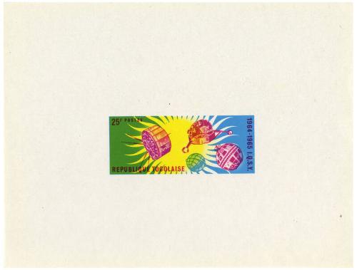 Physical DescriptionPostcard-sized (part A) and postage stamp-size (part B) die proofs for one of a series of 6 space themed stamps issued by the Togolese Republic in 1964. Design is three red satellites and a green planet in front of a yellow/white sun and fields of green and blue in the background. Printed "Republique Togolaise / 1964-65 I.Q.S.Y / .45F Postes."