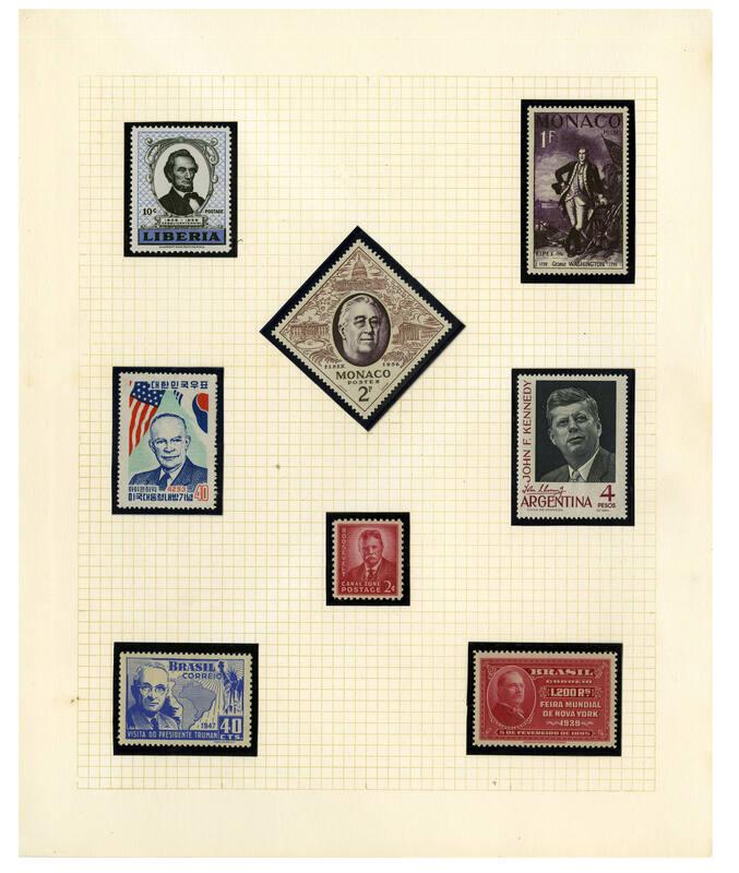 Physical DescriptionPhysical DescriptionStamp Scrapbook Page. Eight foreign stamps featuring U.S. Presidents. From top to bottom:10c 1959 Lincoln stamp from Liberia, 2f 1956 FDR stamp from Monaco, 1f Washington stamp fromMonaco, 40 Eisenhower stamp from South Korea, 2c Theodore Roosevelt stamp from the Canal Zone, 40c Truman stamp from Brazil, 1,200 Rs Cleveland stamp from Brazil.