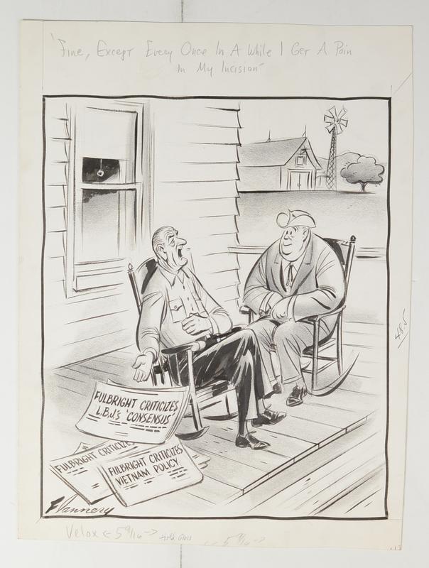 Physical DescriptionPhysical DescriptionOriginal cartoon drawing. LBJ, in a rocking chair on a front porch with a man, casts aside several newspapers ("Fulbright criticizes LBJ's 'Consensus' ", "Fulbright cricizes Vietnam Policy"). Caption reads: "Fine, Except Every Once in a While I Get a Pain in My Incision". Artist signature lower left: "Flannery".