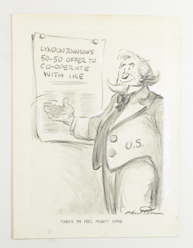 Physical DescriptionPhysical DescriptionOriginal cartoon drawing. Uncle Sam ("U.S.") points to a document ("Lyndon Johnson's 50-50 Offer to Cooperate with Ike") hanging on the wall. Artist signature lower right: "Hutton".