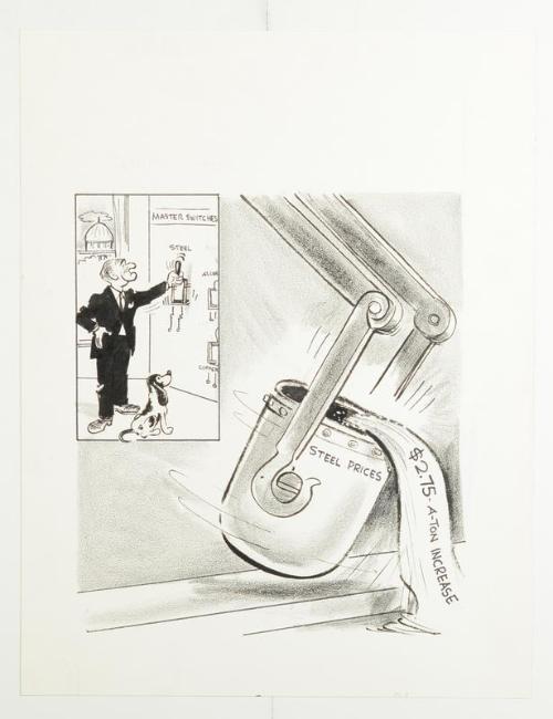Physical DescriptionPhysical DescriptionOriginal cartoon drawing. In the White House, LBJ pulls a switch ("Master Switch") up ("Steel"). Other switches (“Alum” and “Copper”) are on the wall and a beagle sits by his feet. At the plant, a bucket ("Steel Prices") pours out hot molten metal ("$2.75 a ton increase"). Caption: “Remote Control”.