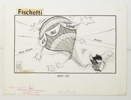 Physical DescriptionPhysical DescriptionOriginal cartoon drawing. LBJ clings to the basket of a rapidly descending hot air balloon. The balloon has been shot through by bullets ("South Vietnam", "Politics"). Caption: "Cross Fire". Artist signature lower left: "Fischetti". Additional text at lower left: "© New York Herald Tribune Inc."