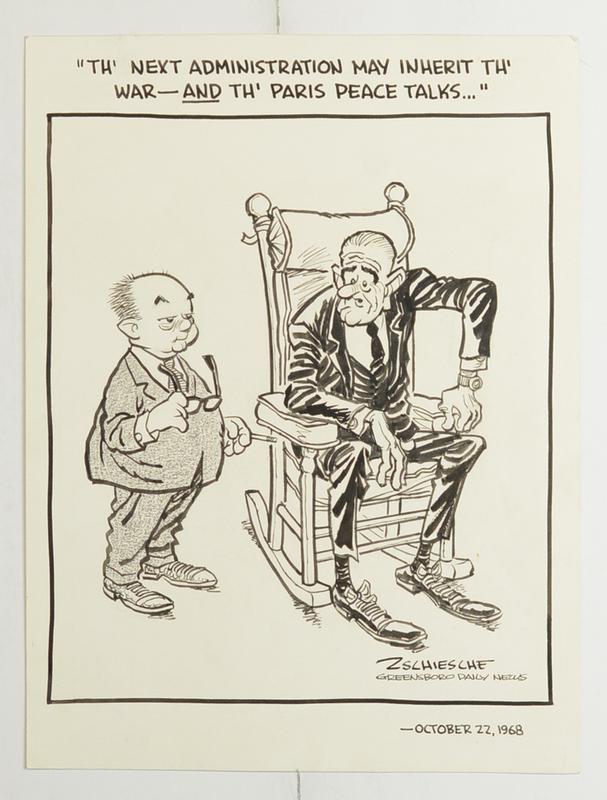 Physical DescriptionPhysical DescriptionOriginal cartoon drawing. LBJ sits in a rocking chair talking to a man (identifiable as Dean Rusk). Caption: “Th' Next Administration May Inherit Th' War--And Th' Paris Peace Talks–”. Additional text at lower right: “-October 22, 1968”. Artist signature lower right: "Zschiesche Greensboro Daily News”.