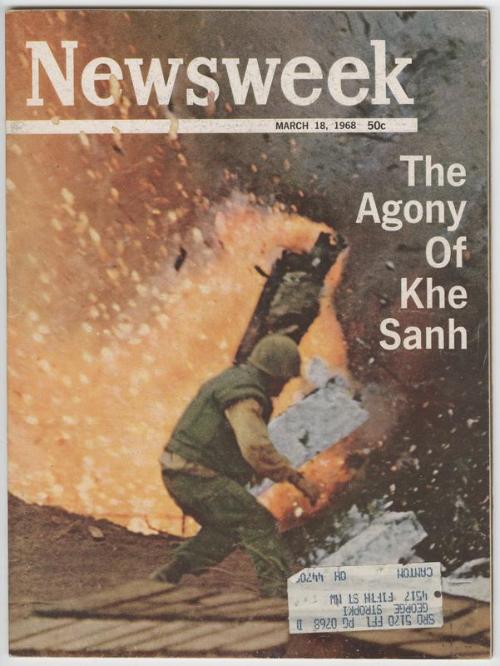 Physical DescriptionPhysical DescriptionNewsweek magazine from March 18, 1968. Cover image of an American soldier recoiling from an explosion. White text reads: "Newsweek", "The Agony of Khe Sanh". Address label adhered at lower right.